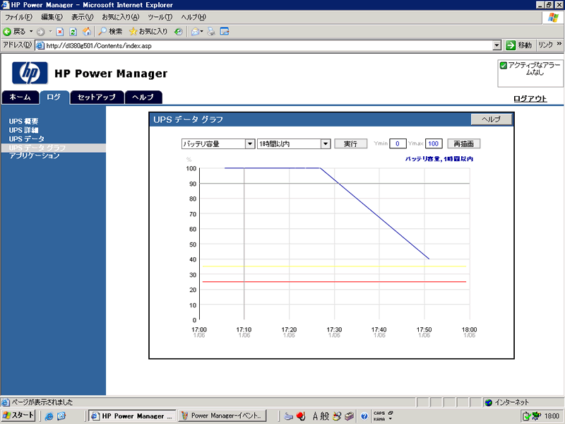 UPSの管理であるHP Power Managerでは、使い慣れたWebブラウザからUPSの管理を容易に行うことができる ※クリックで拡大します ログをもとに、バッテリ容量の推移などをグラフィカルに確認することも可能だ ※クリックで拡大します