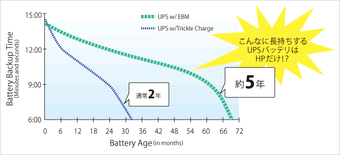 UPSは消耗品であるバッテリを使用するために、その寿命が一番問題になる。UPSを積極的に利用している企業によると、頻繁にバッテリを交換している印象があるというほどで、これはサーバの寿命に比べると、UPSのバッテリの寿命の方が短いためだ。しかし日本HPのUPSは、徹底的な評価試験を行って製品品質を高めるとともに、EBMにより、バッテリの寿命を競合製品の2倍以上にあたる約5年にも引き延ばしている。これにより競合他社よりも長い、3年のパーツ保証が可能になっているのだ。